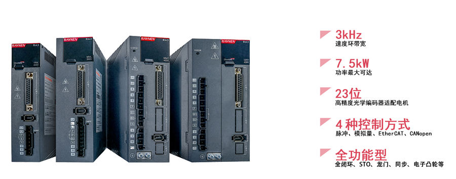 RA3系列全功能型伺服驅(qū)動器是睿能科技依托第三代研發(fā)技術(shù)平臺打造的全新伺服產(chǎn)品,具備高精度、高響應(yīng)、高防護(hù)等特點(diǎn),廣泛適用于機(jī)器人、鋰電、電子設(shè)備、紡織、包裝、機(jī)床和木工等行業(yè),顯著提高機(jī)械設(shè)備生產(chǎn)效率。